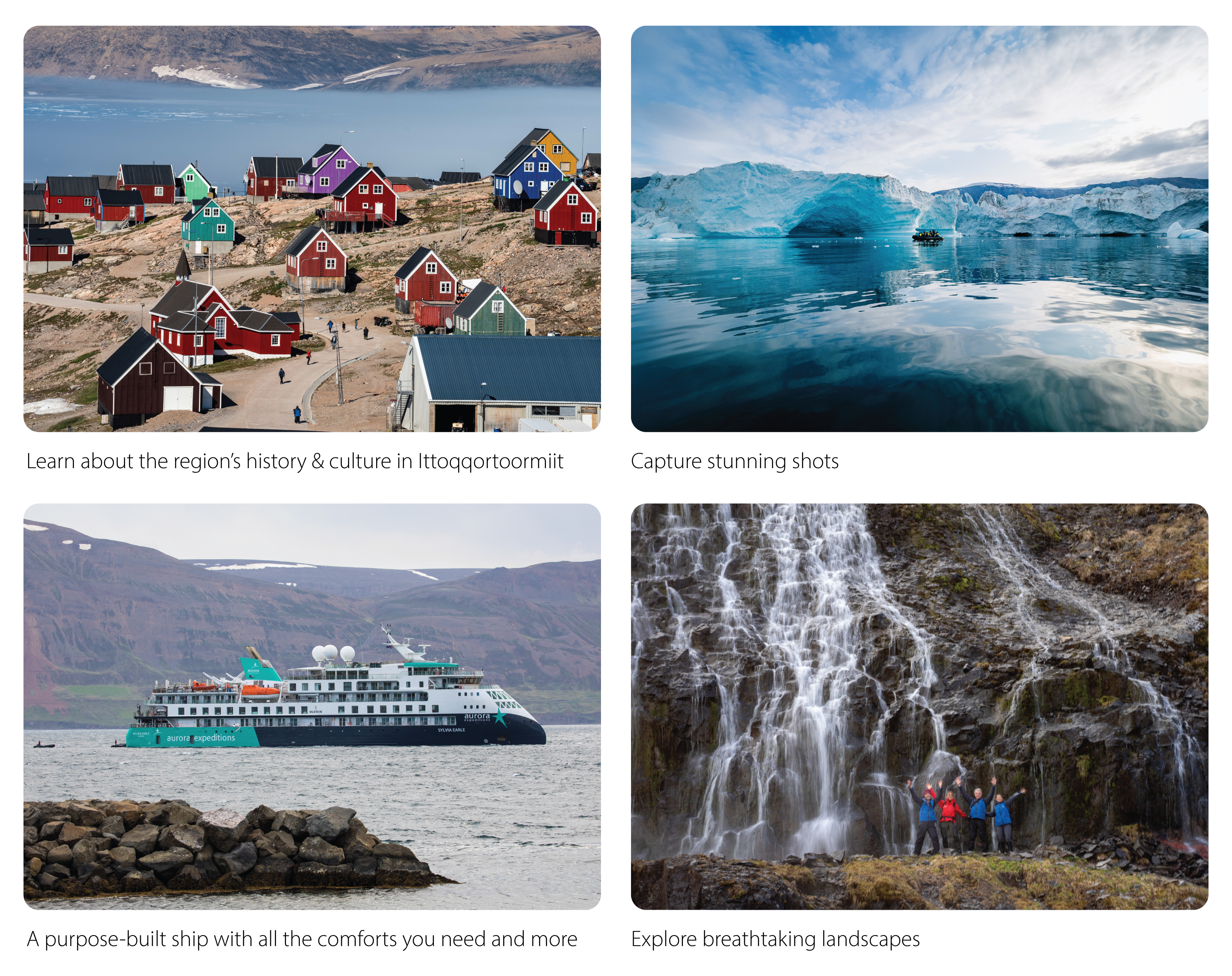 ✓ Witness the dance of light as kittiwakes, arctic terns and glaucous gulls dive amid the sculptural ice – a photographer’s dream!